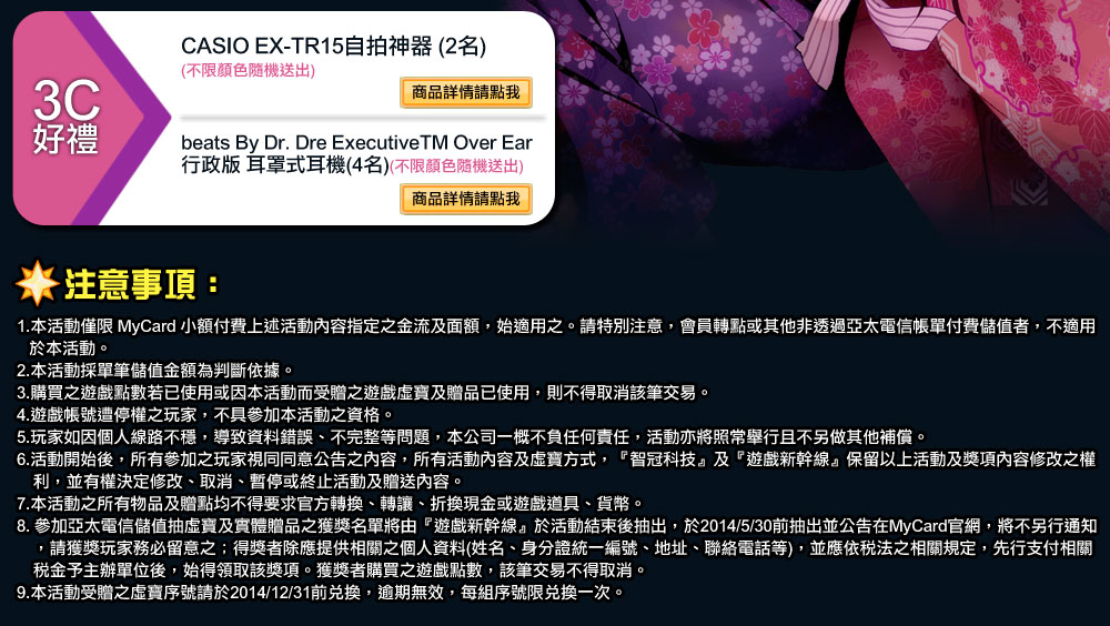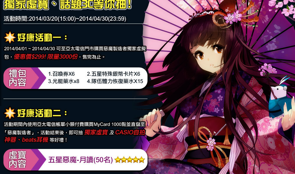 活動期間內使用亞太電信帳單小額付費購買MyCard 1000點並直儲至「惡魔製造者」,活動結束後,即可抽獨家虛寶及CASIO自拍神器、beats耳機等好禮!