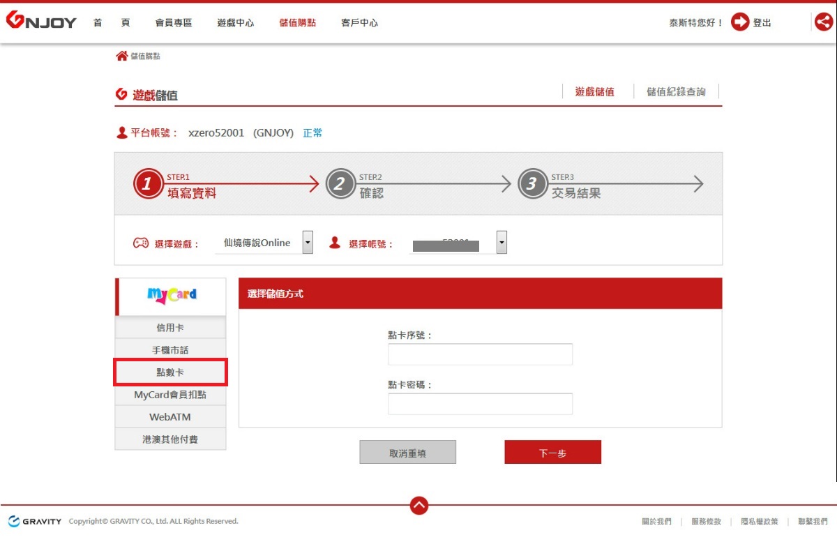 點選「點數卡」,輸入「點卡序號」、「點卡密碼」,點選「下一步」。