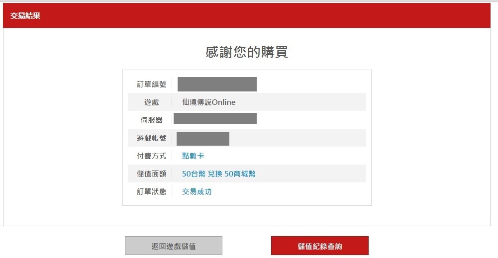 儲值成功畫面。