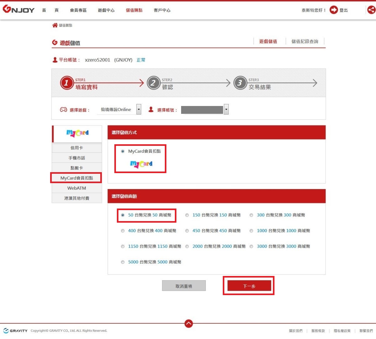 點選「MyCard會員扣點」,並選擇「儲值面額」後,點選下一步。