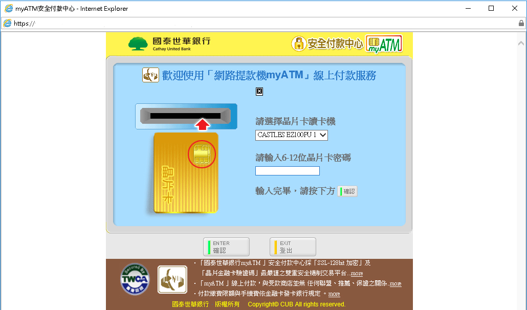 跳至銀行付款頁面,插入銀行晶片卡,並輸入晶片卡密碼進行確認(需具備晶片卡讀卡機並安裝元件)