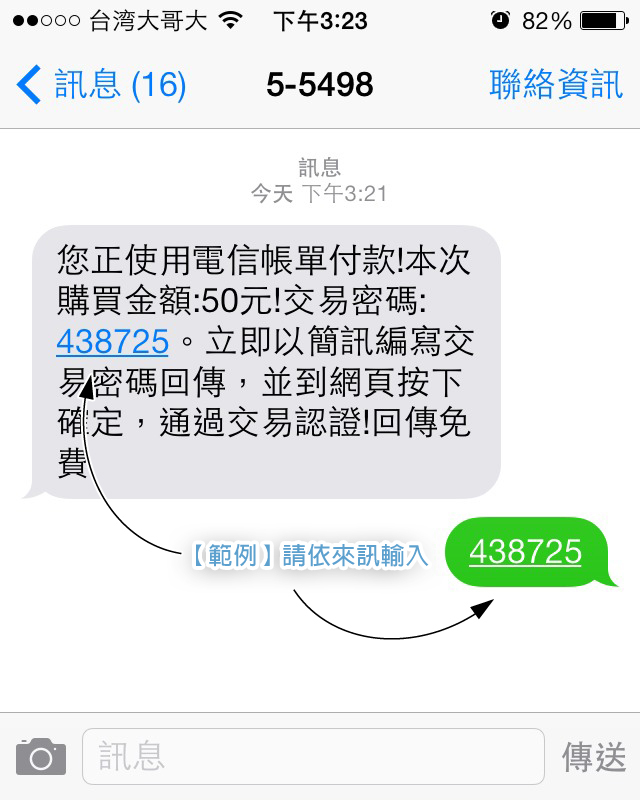 金流認證(將收到的”交易密碼”回傳至發送簡訊的門號中)